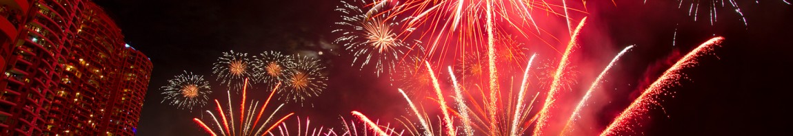 A group of friends witness massive mortar shell fireworks explode while still on the ground during a New Years celebration.